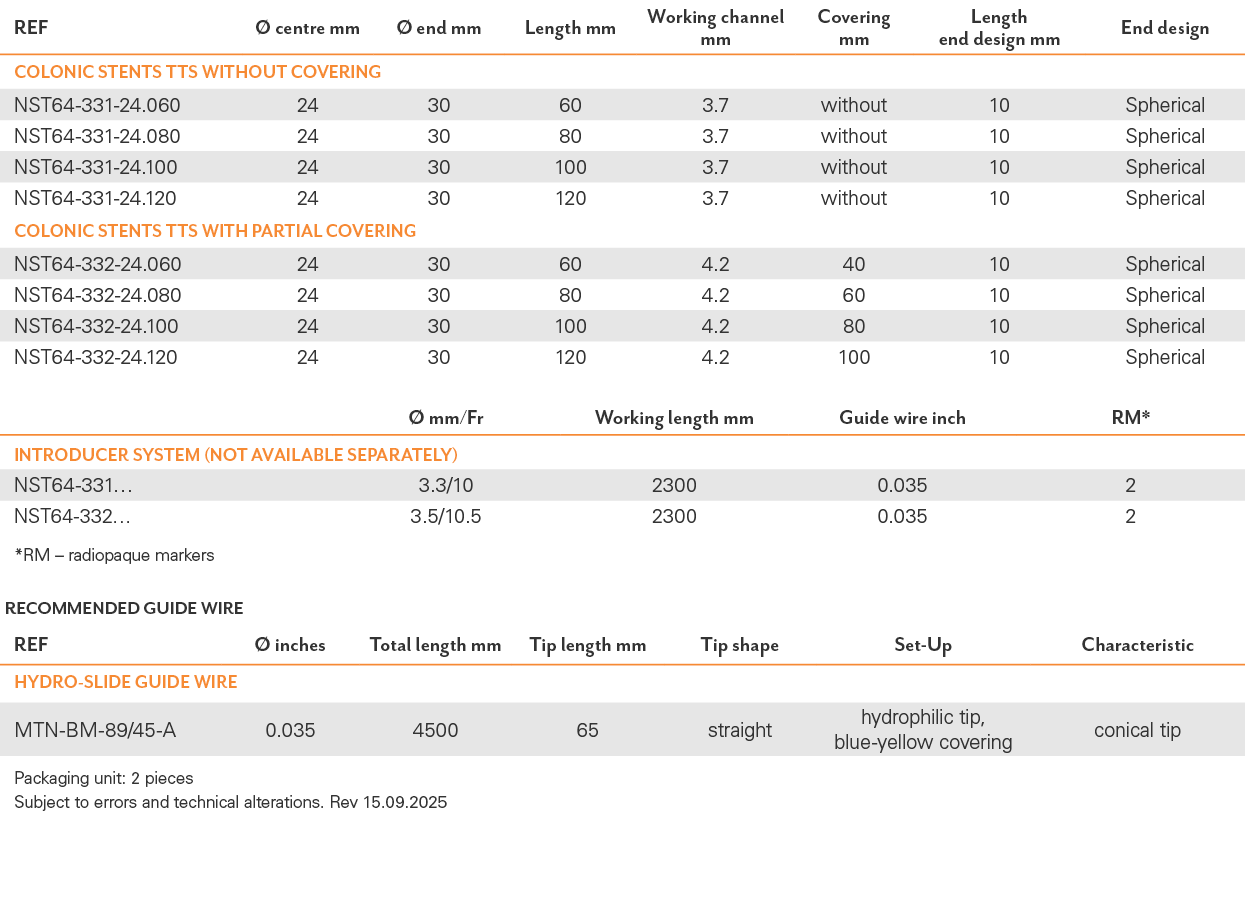 OTW (over-the-wire) systems can be placed over-the-wire, TTS (through-the-scope) Colonic Stents can be delivered through the working channel of the colonoscope. This way, application time is reduced dramatically. Due to the visible endoscopic control during placement stent deployment takes place in an even more controlled fashion. In comparison with OTW Colonic and Rectal Stents, TTS applications are especially flexible and better suited for the curved segments of the colon, e.g. hepatic and splenic.