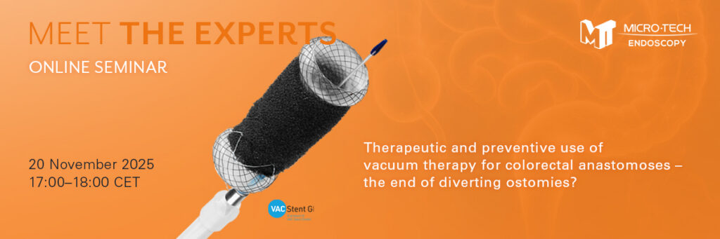 Join us for this free online seminar, where leading physicians – Prof. Dr. med. Matthias Turina and PD Dr. med. Christoph Schlag from University Hospital Zürich – will share their clinical experience with this product: an innovative solution in endoscopic therapy designed to support treatment of leakages and anastomotic insufficiencies in the colon.