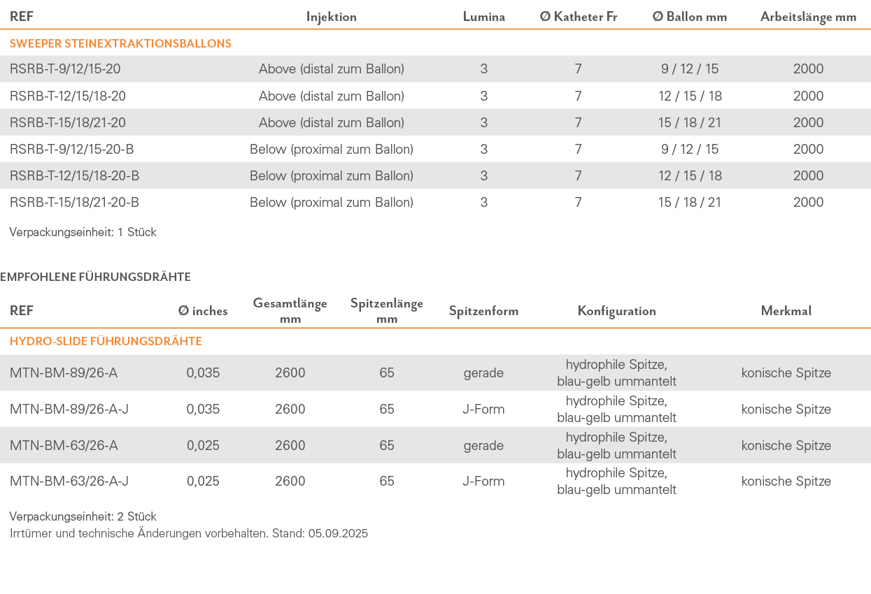 Für die zuverlässige Entfernung von kleinen Steinen und Sludge aus dem Gallengang umfasst das Sortiment von MICRO-TECH hochwertige 3-lumige Extraktionsballons. Die konische, atraumatische Spitze des Katheters sorgt in Verbindung mit den beiden Röntgenmarkierungen für eine leichte und exakte Positionierung. Der zylindrisch geformte Ballon selbst ist aus hochwertigem Latex gefertigt und lässt sich auf drei Durchmesser weiten. Für jeden Ballondurchmesser wird eine entsprechend geeichte Einmalspritze mitgeliefert. Nach der Insufflation liegt der Ballon bündig an der Gallengangwand, so dass eine effiziente und vollständige Reinigung des Gallengangs gewährleistet ist. Ein separates Lumen für einen 0,035 Inch Führungsdraht und eines für Kontrastmittel erleichtern die Handhabung und Kontrastmittelgabe.
