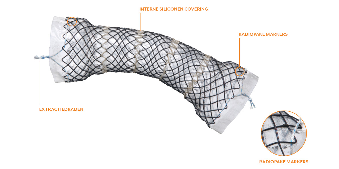 De oesophagus stent met gesegmenteerd ontwerp biedt maximale flexibiliteit en aanpassing voor het overbruggen van stenoses en lekken. In tegenstelling tot traditionele stents uit één stuk, bestaat het ontwerp uit meerdere segmenten die onafhankelijk van elkaar bewegen. Daardoor past de stent zich goed aan de anatomie en peristaltiek aan en zorgt hij voor maximale positionele stabiliteit. Door de segmentatie verliest de stent nooit zijn gedefinieerde lumen. Alle gesegmenteerde stents hebben een dubbele volledige ommanteling en twee extractiedraden voor veilig verwijderen en herpositioneren van de stents.